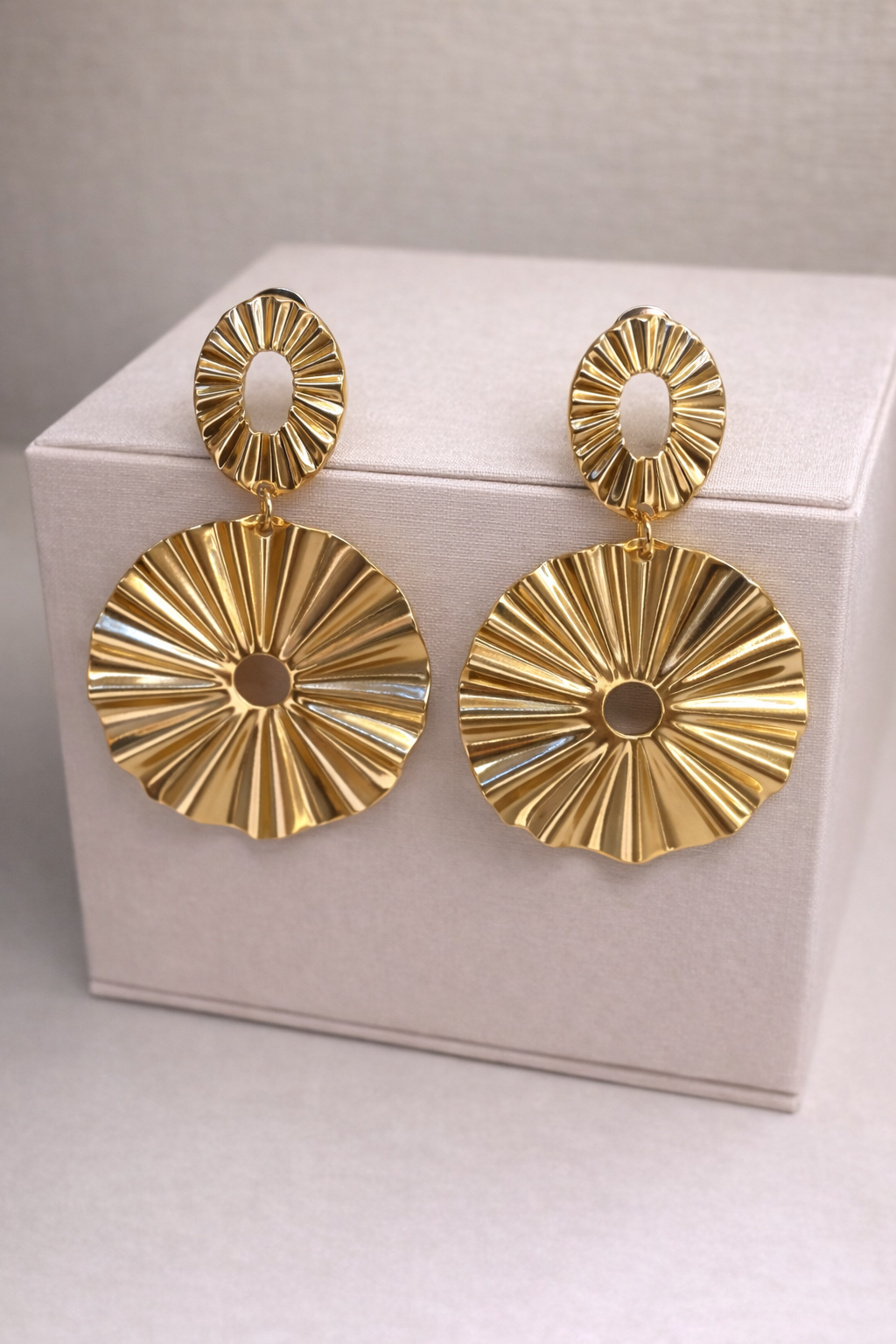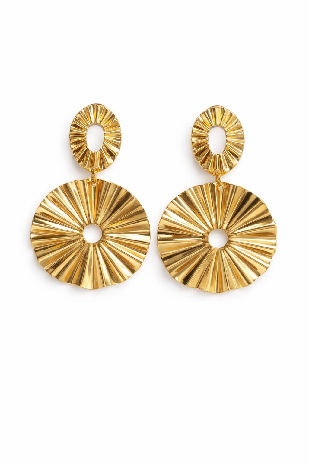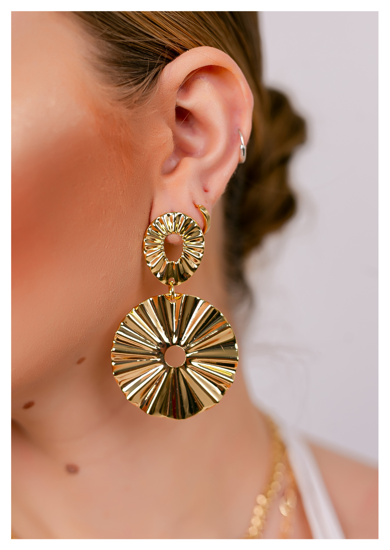 Com design escultural e brilho metálico, é pura ousadia. Suas formas circulares sobrepostas remetem ao movimento do sol, criando um efeito tridimensional deslumbrante.